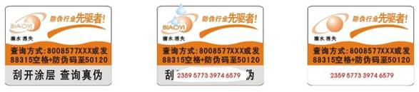 在實際生產中,可將數碼防偽技術用在產品其他標簽、包裝盒以及包裝袋上。如以下圖是在包裝盒上: 數碼防偽技術也可與滴水防偽相結合,滴水防偽就是正常情況下,能看相應文字或預定圖案,而把水滴在相應部位,則該圖案消失,而水干后又能恢復到原來模樣。樣稿如下: 數碼防偽技術也可與溫變防偽相結合,溫變防偽就是正常情況下,能看到相應圖案或文字,而在相應部分進行加熱處理(一般情況用打火機),就可使相應部分消失,溫度變到常溫時,其圖案又能恢復到原來狀態。樣標如下: 數碼防偽技術與其他更多防偽技術或產品的結合不再一一列舉。 歡迎點擊主頁右上角live800進行實時對話
