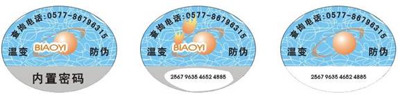 數碼防偽技術也可與滴水防偽相結合,滴水防偽就是正常情況下,能看相應文字或預定圖案,而把水滴在相應部位,則該圖案消失,而水干后又能恢復到原來模樣。樣稿如下: 數碼防偽技術也可與溫變防偽相結合,溫變防偽就是正常情況下,能看到相應圖案或文字,而在相應部分進行加熱處理(一般情況用打火機),就可使相應部分消失,溫度變到常溫時,其圖案又能恢復到原來狀態。樣標如下: 數碼防偽技術與其他更多防偽技術或產品的結合不再一一列舉。 歡迎點擊主頁右上角live800進行實時對話
